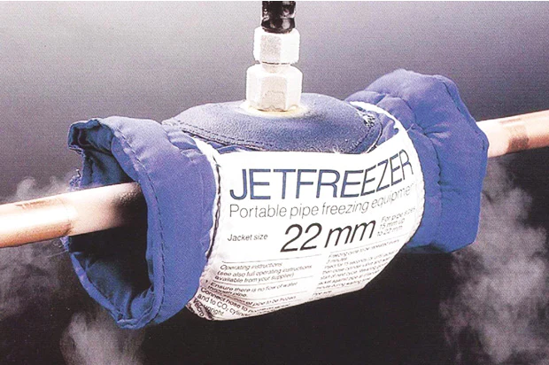 管内に氷の栓を生成することによって配管の漏水工事、配管変更工事、バルブの交換工事等を、管内の水を抜かずに可能にする工具です。